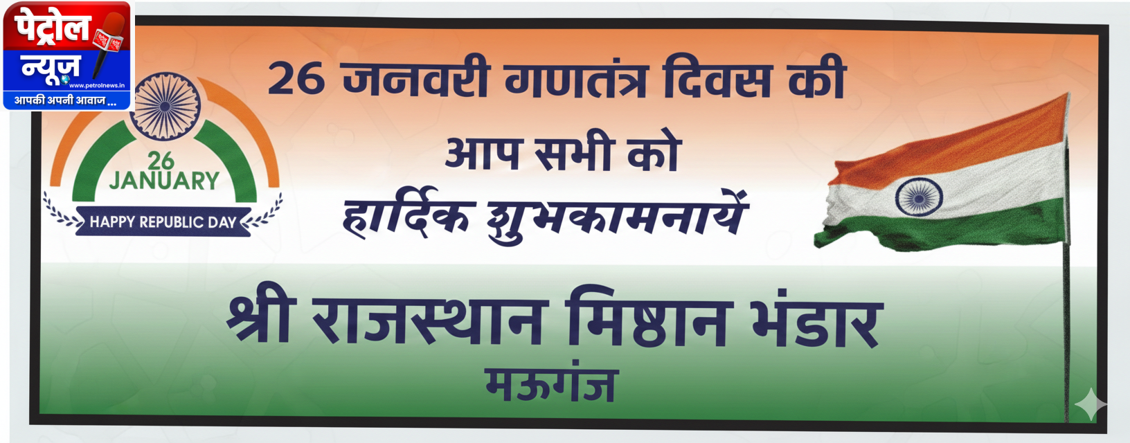 Mauganj :गणतंत्र दिवस पर श्री राजस्थान मिष्ठान भंडार, मऊगंज की ओर से देशभक्ति से ओतप्रोत शुभकामनाएं